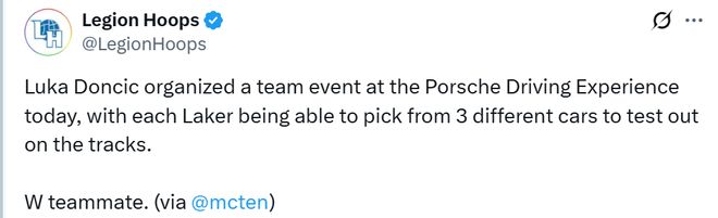 據ESPN記者麥克梅納明報道,在湖人隊的訓練結束后,東契奇決定組織一場球隊團建活動。湖人隊在今年夏天進行了部分陣容調整,目前仍處于團隊默契培養階段。為推進這一進程,東契奇策劃了此次保時捷駕駛體驗活動。麥克梅納明表示,隊員們將有機會駕駛該品牌的多款高端車型。每位湖人球員都可以從3輛不同的汽車中挑選一輛在賽道上進行測試。